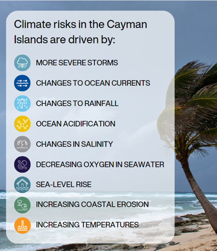 The approved Cayman Islands Climate Change Policy 2024-2050 is largely guided by the Climate Change Risk Assessment which was conducted in 2022. Funded through the Governor’s Office by the United Kingdom’s Conflict, Stability and Security Fund, and following extensive desktop research, technical stakeholder consultation and public engagement, the resulting Cayman Islands Climate Change Evidence Report (2022) is now the most comprehensive reference document to date on the potential implications of climate change on the Cayman Island’s environment, society and economy.
